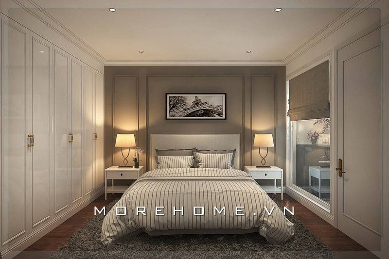 Một mẫu thiết kế nội thất hiện đại cho nhà phố, bao gồm tủ quần áo kích trần âm tường, được xem là một giải pháp hiệu quả để sử dụng trong không gian phòng ngủ nhỏ.